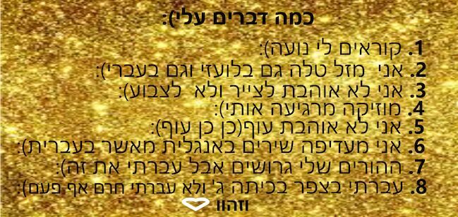 @יעל15098 הנה תשובות לתגובה שלך❤ 1. תודה אגב יש לי חברה בשם יעל❤ 2. חחחח 3. הכי כיף! 4.אין על מוזיקה❤ 5.אכן❤ 6. תאומתי❤ 7. קחי, נפל לך הכתר❤ 8. חחח מזל❤ לסיכום ריגשת ואת תאומה שלי מהיום❤❤❤ |
