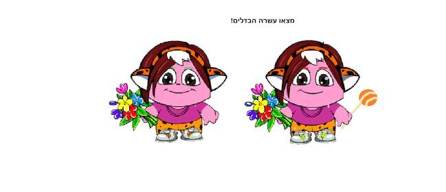 אמממ אוקייי אני מתחילה (לא העתקתי מאלו שלפני) 1. אין סוכריה ויש סוכריה 2. גבות ורודות (או אדומות, לא רואה טוב) וגבות ירוקות 3. חיוך בינוני וחיוך גדול 4. אין אף ויש אף 5. הנקודה בעין אפורה והנקודה רגילה 6. שרוכים צהובים ושרוכים כתומים? (לא רואה את הצבעים) 7. בימין בפרח יש לבן בשמאל לא 8. יש שערה קטנה כזו בשיער 9. נקודה אחת במכנסיחם במקום שחור בצבע אחר 10. הצל באוזן ימין בצד ימין יותר כהה צדקתי? (עכשיו מסתכלת בתגובות...) |