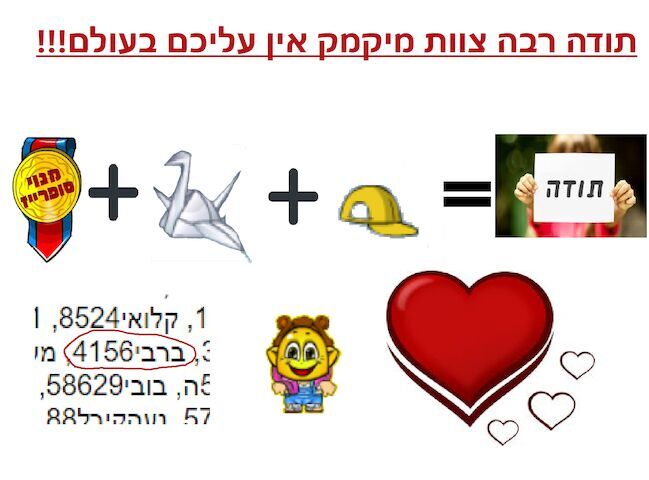 אז צוות מיקמק באמת שאני ממש מודה לכם דרך אגב זאת הפעם הראשונה שאני זוכה וזה באמת מרגש אותי ממש אז תודה רבה רבה רבה!!!!!!!!