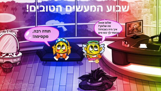 אוקיי אז אני יודעת שהיצירה באיחור, כל פעם התעצלתי לשלוח...... אבל עדיין לא נגמר השבוע! השבוע הזה, שהתחיל מיום ראשון, היה שבוע המעשים הטובים! בקובץ ששיתפתי רואים אמא שמגיע לבית אחרי יום עבודה, והבת שלה שואלת מה שלומה, מתעניינת איך היה בעבודה, ומגישה לה כוס מים :-) היא גם עשתה מעשה טוב, וגם מצוות כיבוד הורים! :-) ♥♥