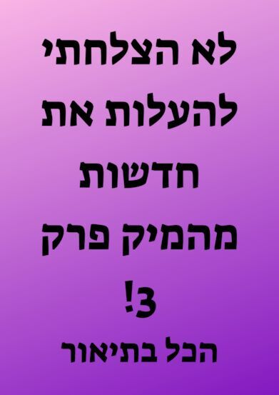 אז היוש לכולם כמו שראיתם בתמונה אני לא מצליחה להעלות את החדשות מהמיק פרק 3 ואני לא יודעת למה! ניסיתי כמה פעמיים אבל כלום לא עלה אם את קוראים את זה זה אומר שאין לי בעיה בקהילה אלה ביצירה הספציפית הזאת... אני מקווה שזה יפתר ובינתיים אני ימשי לעלות כבר את פרק ארבע שיצא בקרוב! תודה לכולם! אוהבת אותכם מורשת121