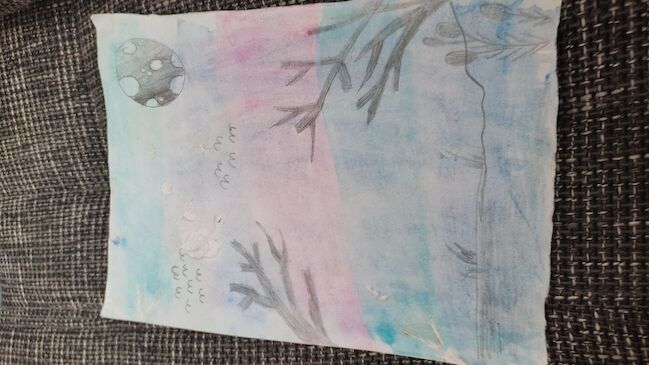 היום הכנתי פה ציור וכן אני אשמח עם תוכלו להגיד לי כמה שיותר רעיונות ליצירות כי די נעלמתי בזמן האחרון XDD..... ...... אז אני יתחיל לעלות קבוע. טוב לעיניננו? ------------------------------------------------------------------------------------------------------------- אז זה ציור שעשיתי בבית הספר באמנות והיה צבעי מים והתחלתי מהצבעים והרקע אז לקחתי גוון סגול כחול (צבעים שאני ממש אוהב) ואז התחלתי קצת ערבבתי שסיימנו נתתי את זה לחבר שלי שיצייר על זה משהו יום אחרי הוא חזר עם ציור מהמם!