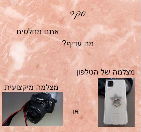 מה שאני מעדיפה זה מצלמה של טלפון אבל מה שלדעתי יותר חשוב זה מצלמה מיקצועית כי ככה מצלמים סידרות |