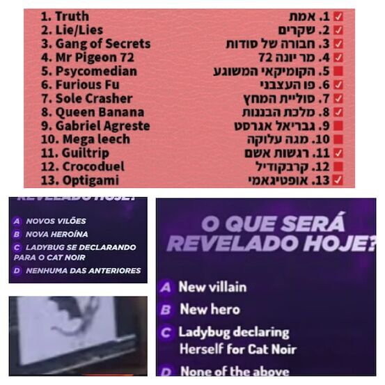דבר שני עלה בספרדית ובאנגלית דברים שעומדים להיות בסדרה : 1. הולכים להיות נבלים חדשים 2. גיבור חדש 3. ליידיבאג הולכת להכריז על עצמה בשביל חתול שחור - או שמדובר בגילוי זהויות או שחיפושית תסגיר את עצמה בשביל חתול שחור אני לא בדיוק יודעת. 4. ואז ברביעי רושמים אף אחד מאלה שלמעלה - אתם בטח צוחקים עלי! כי על חלק מהדברים שרשמו למעלה אנחנו כבר יודעים אז במה לעזעזל הם מתכוונים באף אחד מאלה שלמעלה???!!! שהדברים האלה לא יקרו? שהם יקרו? ואם הם לא יקרו למה בכלל טרחו לפרסם את הפוסט? אז לפרוטוקול לי אין מושג!. לכל מי שחושב שאני ממציאה הדברים האלה רשומים למעלה בריבועים הסגולים באנגלית ובספרדית למי שמבין אז כן אני מתוסכלת!