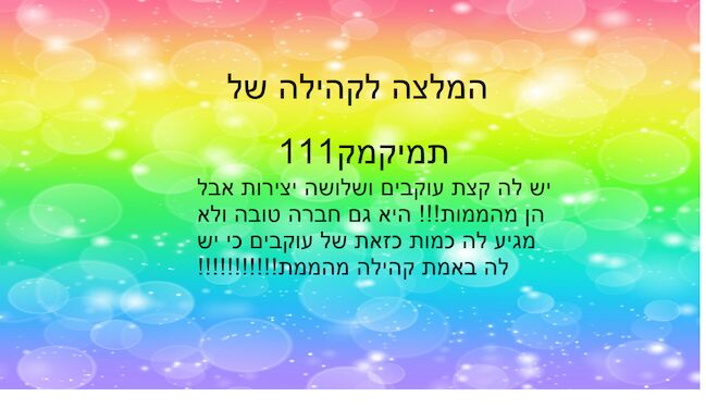וואי!!! אתם לא תאמינו מה ראיתי!!! נכנסתי לקהילה של תמיקמק וראיתי שבזכותכם אהובים שלי יש לה 16 עוקבים ב 5 יצירות שזה מדהים!!! דיברתי איתה והיא באמת התרשמה!!! תודה שאתם בוטחים בי, אתם לא יודעים כמה זה חשוב לי |