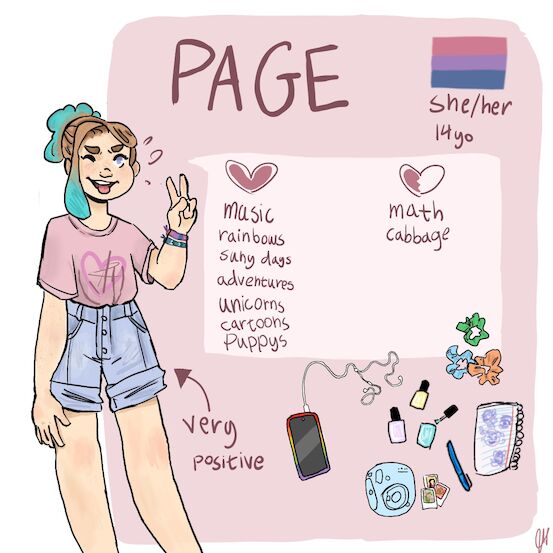 איזו דמות מעניינת!! מאוד אהבתי את הפרטים הקטנים כמו הדגל והצבע של הטלפון! ואני דומה בכמה דברים אצל פייג' גם אני אוהבת דברים מצוירים ומוזיקה אשמח שתספרי לנו על עוד דמויות שציירת :) |