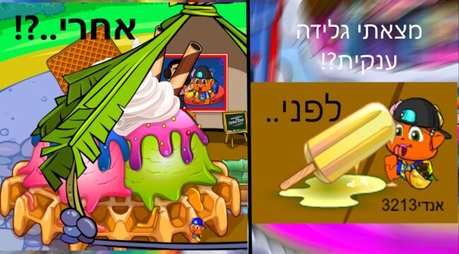 היי אנדים ואנדיות! כאן אנדי! איך החופש? קניתם דברים לבית ספר? ______________________________________ 1.נושא: גלידה ענקית?! אעאעאעאע נכון המשימה של ראש העיר? סיימתי אותה די מהר:) אני יכתוב לכם גם את התשובות.. ותאמינו או לוא תראו מה קרה!!!!! חשבתי שזה יהפוך לגלידה בגודל של הארטיק....מסתבר שטעיתי...הגלידה היא ענקית!!! ____________________________________ 2.קישורים: הינה קישור לשאלות תשובות שאני עונה עליו מחר! ____________________________________ (מקווה שהקישור עובד) אז אני הייתי אנדי אתם הייתם אתם ,מדהימים כמו תמיד! אז י א ל ה ביי! אנדי3213
