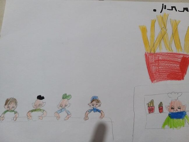 כי ציירתי את המיקמקים יושבים ואוכלים ביחד במסעדה