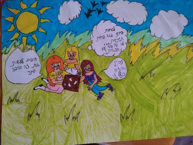 היי מיוחדים! אז ציירתי ציור לבלוג הפרס "חבילה עוברת" שלושה בנות (אני ושתי חברות שלי...) בחצר משחקות חבילה עוברת מפני שלא יצא לנו להפגש המון זמן! כמובן שאני באתי יותר מידי חגיגית ובקושי הצלחתי לשבת..