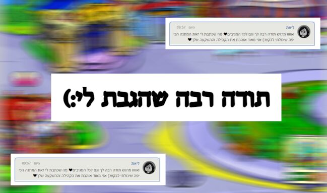 איזה כיףXD גם אני כתבתי לה ברכה (לא בשביל שהיא תגיב לי.. הרגשתי שהרבה מעלים על זה יצירה, ואם היא מגיבה, היא רואה.. אז החלטתי לעשות לה אחד, תמיד רציתי:) |
