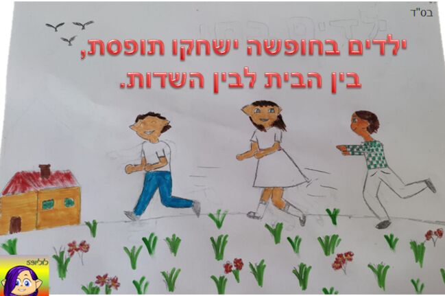 היי כולם! אז לכבוד המיקשימה החודשית, שבה אמורים להכין משפט משיר של ראש השנה ולהכין אותו, הכנתי את המשפט "ילדים בחופשה ישחקו תופסת, בין הבית לבין השדות" יש שלושה ילדים שמשחקים תופסת בשדה הפתוח:) מקווה לזכות!
