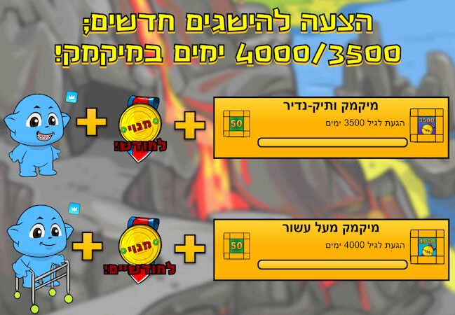 אז זאת ההצעה שלי לצוות מיקמק (הם יכולים להחליף את הפרסים) : 3500 ימים במיקמק = 50 נק' הישגים + מנוי לחודש + פריט שיניים תותבות נדיר 4000 ימים במיקמק = 50 נק' הישגים + מנוי לחודשיים + פריט הליכון נדיר