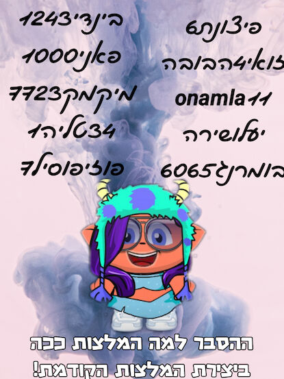 מושלםםםם לא הבנתי אם המלצת לי או לא כי בתמונה כתוב את השם שלי אבל בתיאור לא כתוב;) בכל מקרה תודה רבהההה זה ממש יפה מצדך שאת עוזרת לאחרים וממליצה עליהם! יש לך קהילה מהממת(: |