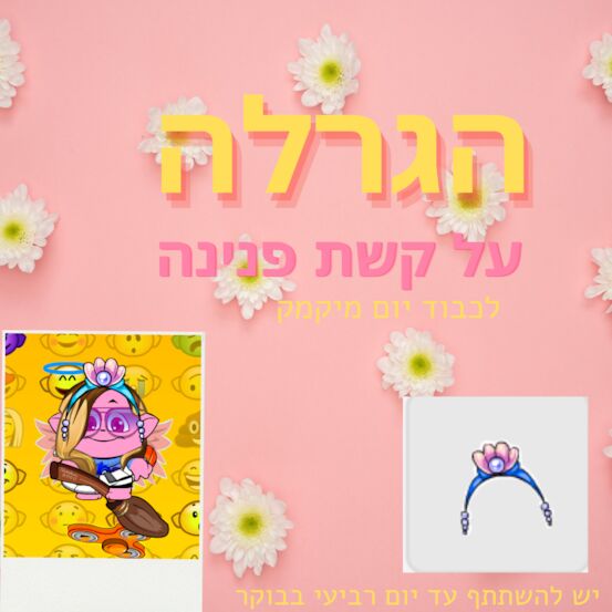 יאא מהממת!! הגרלהה!! עשיתי הכלל!! אבל תקשיבייי אני פשוט לא בטוח יעלה לקהילה יצירה מחר ומחרותיים.. אפשר להישתתף ומקסימום אחרי ההגרלה אני יקדיש לך ואני יוכל גם לעשות לך המלצה? |