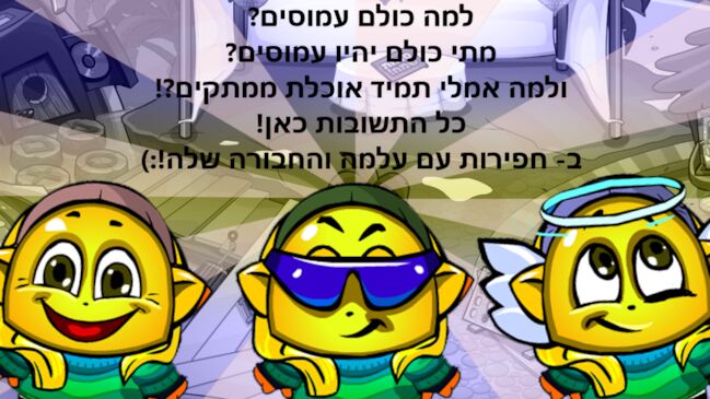 אני: אמ, סוגשל... אז ככה, פשוט ביום שהמצאתי אותה חשבתי באותו זמן על סוכריות וממתקים:)) אזזז הכנסתי את זה לקטעים והה כן! תשובה XD. ---- 4. מה זה אמירים? תמיד כשאני אומרת לחברות שלי (במיקמק) שאני מסיימת מאוחר כי יש לי *אמירים*, אז הן כזה: "וואטטטטטט?" ותמיד אין לי כוח להסביר אזזזז נסביר פה!:)