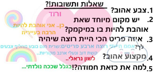 היי 1. בת כמה את? 2. תוכלי להמליץ על הקהילה שלי? 3. למה את כזאת מושלמת 4. רוצה לעשות שתפ? 5. את אוהבת אותי? |