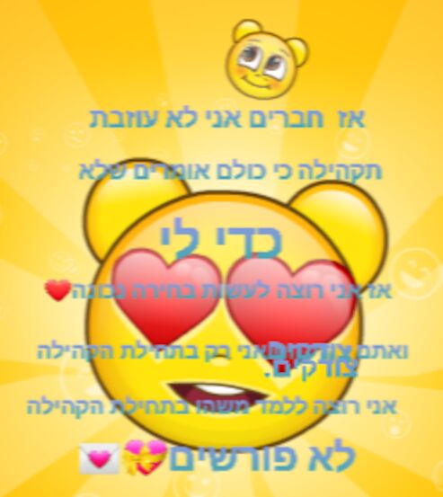 יששששש חברים אני לא עוזבת גם תודאו שלא אעזוב מיקמק כי אני משגעת כל שניה עושה הפסקה פורשת עוזבת קהילה סליחה חברים בחיים אשגע אותכם