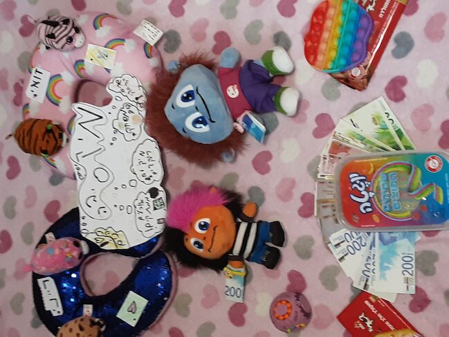זה מכירת משהו? רק שתדעי שהבובה הורודה של החד קרן (קטנה כזאת מעל הכרית הכחולה) קוראים לה פנטזיה (אני חושבת) כתוב בפתק באנגלית fantasia כמו השם שלי:))) האמת שהמיקמק שלי נקרא על שמה רק שהבובה שלי היא בגודל ענקי°•° |