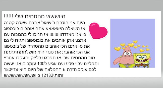 עקבתי ושמתי לייק ואני אוהב בובספוג והכי הרבה את בובספוג ופטריק |