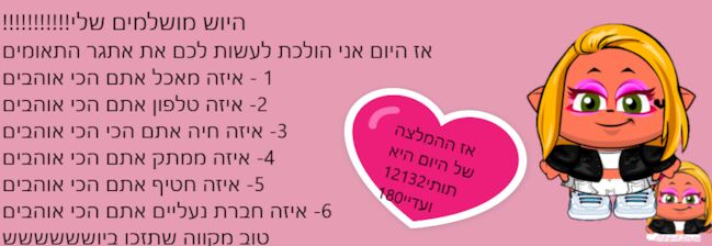 אני כבר מכירה אותך מהכיתה כי אנחנו החברות הכי טובות אבל לא משנה 1-אמבורגר 2-איפון11 3-כלב\ה 4-רולר 5-אפרופו איטלקי 6-גורדן,פילה [לא ידעתי מה ליבחור] יש לי משהוא שאני יודעת שאת הכי אוהבת אותו אבל שכחתי לרגעעעע |