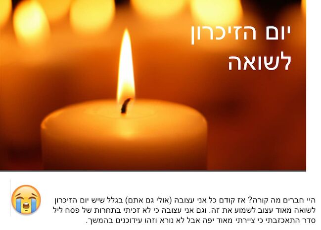 זה היה שבוע שעבר היום זה יום הזיכרון לחללי צה"ל אבל כל הכבוד על ההשקעה קימי |