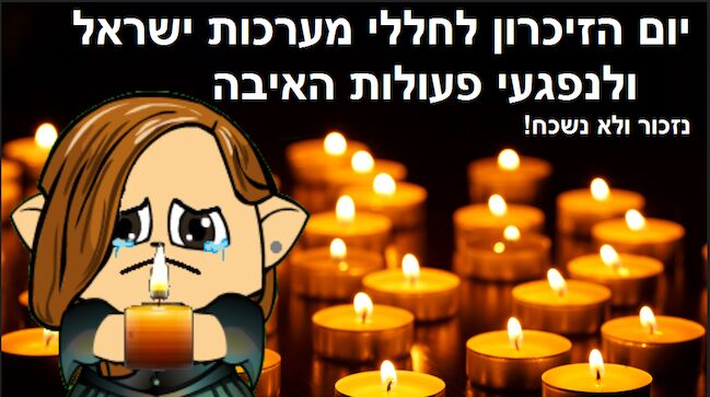 אז, היום הוא יום הזיכרון לחללי מערכות ישראל ולנפגעי פעולות האיבה. על הדברים הרעים שקרו, ועל זה שיש לנו מדינה בזכות צה"ל! :( גם לפני כמה זמן היה את יום הזיכרון לשואה ולגבורה, זה פשוט ככ עצוב... וגם אסון המסוקים לא אפילו יותר גרוע... חשוב שנזכור את כל הדברים האלה, אמנם היו המון רגעים עצובים עד שהייתה לנו את המדינה, אבל אנחנו מדינה חזקה בזכות צה"ל והפעם מי שיילחם בנו אוי ואבוי לו! D: אבל יש גם את יום העצמאות! :) עם כל הספריי שלג וכאלה(≧▽≦) והדגל המ-ד-ה-י-ם שלנו תגידו לי, איזה דגל יותר יפה ממגן דוד, שני פסים כחולים על גבי רקע לבן?!?! לדעתי הדגל שלנו הוא יותר יפה מכל הדגלים שאי פעם ראיתי ונראה לי אראה! ᕙ༼◕ ᴥ ◕༽ᕗ אמנם ביום הזה אנחנו עצובים, (מאוד) אבל, צריך לזכור שאין כזה דבר אור בלי חושך ;)