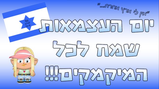 היוש חברים :-) וואי אני מה זה מתרגשת לקראת יום העצמאות! כל שנה ושנה אני רק מחכה ליום הזה.. היום בו הוקמה מדינת ישראל! המון חגיגות, זיקוקים, טקס הדלקת משואות, ומה לא... קיצר מאחלת לכם את כל הכיף שבעולם, תיהנו ותעשו חיים ביום הכיף והמיוחד הזה >< אז ביוש ;) *לצוות מיקמק- אני רק מבקשת אם אפשר לשים את היצירה בתמונת היום כי ממש השקעתי:) תודה רבה!
