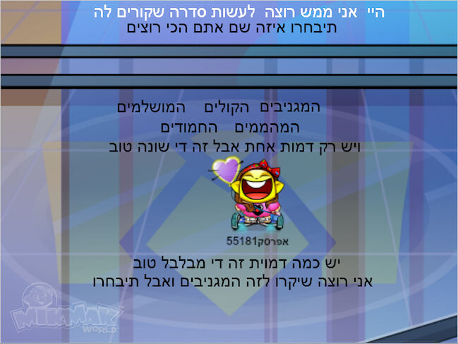 התאור היה שהיי לכולם אני רוצה לעשות סדרה המון זמן השמות המגניבים קולים חמודים המושלמים המהממים אתם צריכים לבחור שם שאתם רוצים שזה היה השם של הסדרה אני היה הסחקנים שמשחקת את כולם זה היה די משובך ביי אפרסקים |