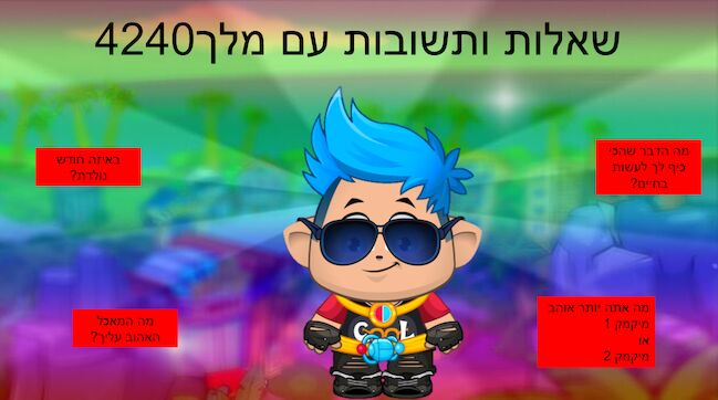 שאלות: 1 מה צבע אוהב עליך? 2 מה חלום שלך? 3 למה בחרתה לקרוא למשתמש שלך המלך4240 ? 4 כמה עוקבים אתה רוצה להגיע? 6 שמתה לב שאין חמש? 7 איזה מנהל או מנהלת אתה אוהב? 8 איזה אוכל אתה אוהב? 9 באיזה עבודה תרצה לעבוד שתהיה גדול? 10 איזה קהילה אתה אוהב? 11 איזה תוכנית טלוויזיה אתה אוהב לצפות? 12 חתול או כלב או אחר |