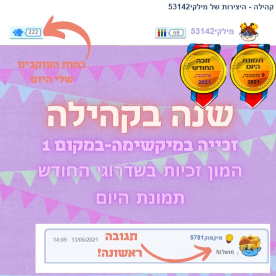 יואוו מהמםםם!!! וואו שנה... זה המוןן!! השיגים ממש מגניבים השגת בקהילה!! כל הכבוד!! :) יווו תודה גם לך מילקי!! ❤❤❤ את חברה מהממת שתמיד מפרגנת ועוזרת!! ❤ באמת זכיתי בחברה כמוך!! ❤ איזה מגניב זה 222 עוקבים!! באמת מספר ממש מגניב!! שנה בקהילה יחד - הזמן עובר מהר כשנהנים!! שוב המון המון תודה על ההקדשה ומזל טוב על שנה בקהילה!!! ❤ |