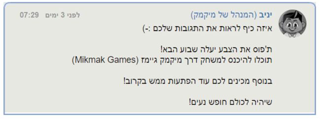 וואו היי לכולם, יניב כתב תגובה ביצירה הזאת שלו וזה כל כך מגניב שזה יוצא השבוע אני ממש מתרגששששששששששששששששששש, זה יהיה במיקמק גיימס חחחחחחחחחחחחחחחחחחחח, לאט לאט יהיו מלא מלא משחקים במיקמק גיימס :) המוקדש היומי: yaniv קישור לקהילה: קישור לקהילה של roei888 עד הפעם הבאה ביי