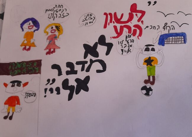 היי מיקמקים שלי!! טובב אז הכנתי את בלוג הפרס, למרות שהיו בו כמה פשלות וטעויות אבל לא נתייחס לזה כי הכל משמיים. עכשיו נעבור למה בתמונה? 1.למעלה משמאל יש שתי ילדות שצוחקות על ילדה מכיתתן שקיבלה 60 במבחן. 2. למטה מימין יש ילד שהוא בעצם הקוף החכם, שלא מקשיב להן, מכסה את אוזניו, ואומר לשון הרע לא מדבר אליי! 3.למטה משמאל רואים ילד שצועק: הפסקה! ואם נסתכל קצת יותר למעלה נראה שלט שאומר יציאה למגרש. 4. באמצע מימין יש שער כדורגל שבו הילד כביכול עוד מעט ישחק וישתמש בו.