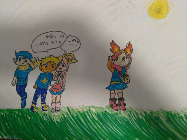 שתי ילדים מהבית ספר רואים סרטון על ילד ובאים להגיד משהו כנראה לא יפה אלמז הבת סוטמת אוזנים ואלמז הבן במקרה עובר לידיהם ומסתיר את העיניים