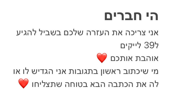 תודה לכם על התגבות אני רוצה שלעוד משהו אני הקדיש אז ככה מי שמביא חבר וגם חבר שלו עשה לייק שיכתוב שיתפתי מישהו ומי שראשון יביא חבר אני גם הקדיש לו ❤️ |