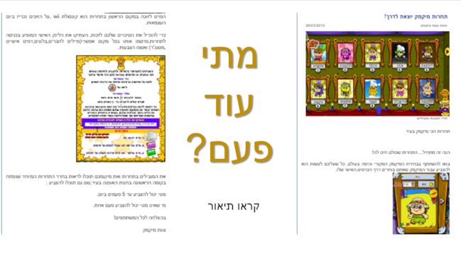 היי לכולם! היום סתם התענייתי בבלוגים הישנים של מה חדש ומצאתי פתאום את התחרות הזאת שפעם הייתה, זאת תחרות שבה אם רואים מיקמק שנראה לנו מקורי ומגניב אז בכרטיס האישי שלו אפשר להצביע לו והמיקמק שהצביעו הכי הרבה הוא הזוכה בתחרות! התחרות הזאת נראית לי ממש מגניבה אז אני מקווה שהיא תהיה עוד פעם כי זה יהיה מאודד מגניב... אשמח שתעקבו אחריי תודה!