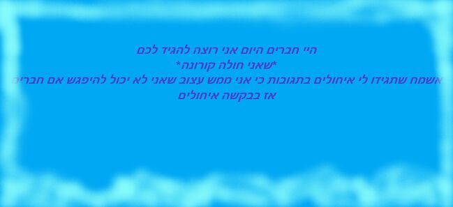 שלום לכל מי שרואה זאת. תודה על כל האיחולים ועל כל מה שאתם כותבים בימים אלה אני לא יוצא מהבית. וממש קשה לי כך שאני לא יכול לפגוש חברים. |