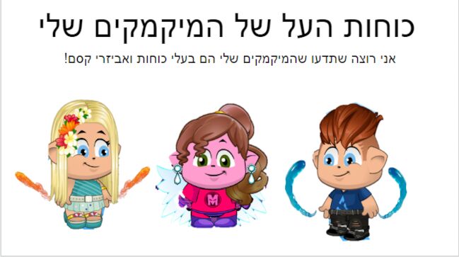 שלום לכולם! עכשיו אני אמרתי לעצמי, וואו, הכנפיים שלי מדהימות! וגם כוח האש של המיקמק האחר שלי מדהים! וגם כוח המים של המיקמק האחר שלי מדהים! אז... יצרתי את החבורה החדשה!!! אני (אוצר3290): כנפיים חזקות, כפפות חשמליות, בגדים נוחים לריצה, ועגילים שיכולים להיפתח ולהוציא בועה מגינה. 062א: בגדים חסינים לאש (כי היא שולטת באש), צמיד שיורה סילוני מים (בעיקר בשביל אליצור80), ועגילים שיכולים להוציא גלי הלם. אליצור80: לא בגדים מיוחדים, אבל כוח מים קולללל!
