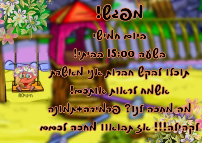 אני לא אוכל לבוא כי אני מסיימת בית ספר ב14:35 ואני הולכת ישר לחוג ורק ב17:30 או 18:00 אני אהיה בבית.. ממש סליחה |