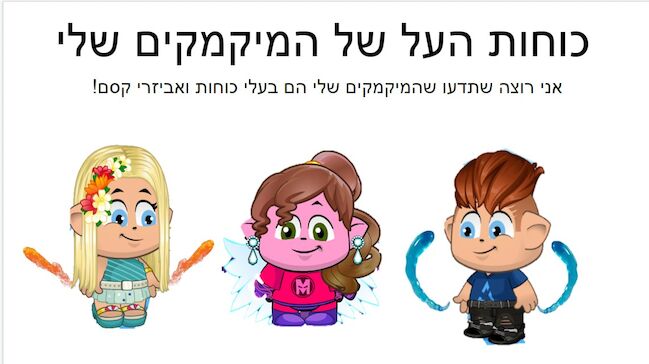 שלום לכולם! עכשיו אני אמרתי לעצמי, וואו, כוח האש שלי מדהים! וגם הכנפיים של המיקמק האחר שלי מדהים! וגם כוח המים של המיקמק האחר שלי מדהים! אז... יצרתי את החבורה החדשה!!! אוצר3290: כנפיים חזקות, כפפות חשמליות, בגדים נוחים לריצה, ועגילים שיכולים להיפתח ולהוציא בועה מגינה. אני (062א): בגדים חסינים לאש (כי אני שולטת באש), צמיד שיורה סילוני מים (בעיקר בשביל אליצור80), ועגילים שיכולים להוציא גלי הלם. אליצור80: לא בגדים מיוחדים, אבל כוח מים קולללל!