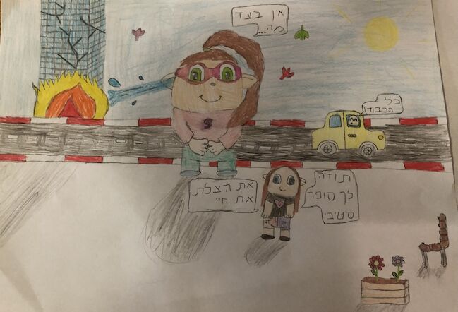 היי מה קורה? אז זה הציור שלי לבלוג הפרס אני מקווה שלא שלחתי באיחור… אני כוח העל של המיקמק שלי הוא: ״להריח צרה ממרחק״ אז הילדה הייתה תקועה על הבנין שעולה באש, ואז אני (סופר סטיבי) הריחה שהילדה בצרה. ובגלל שסופר סטיבי מריחה צרה ממרחק, אז היא מוכנה לכל דבר, אז היא מכבה את הבנין עם מים שהיא יכולה לירות מהאוזן.