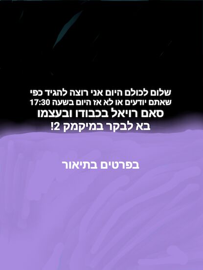 כולם לבוא אם שחור סגול! הצבעים הכי מתאימים לסאם רויאל! בואו כולם!!! לא לפספס!!! שווה ביותר! כיף ממש! סאם רויאל