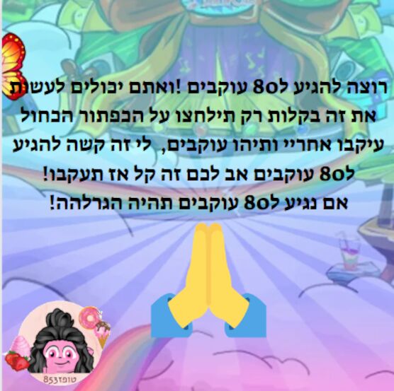 היי סוכריות שלי, מניש?אז אני רוצה שנגיע ל80 עוקבים ואתם מסוגלים לעשות את רק תילחצו אל הכפתור הכחול שכתוב בו עקבוי אחריי וזהו אתם עוקבים שלי , אז בבקשה תעשו את זה לא קשה בשבילכם לעשות את זה , אב לי זה קשה אני משקיעה על היצירות שאני מעלה פליז תעקבו אני מאוד אשמח אם תעקבו , כשנגיע ל80 עוקבים אז תהיה גם הגרלה אז תעקבו אוהבתתתת בייי!!❤❤❤ #לא להעתיק את היצירה#