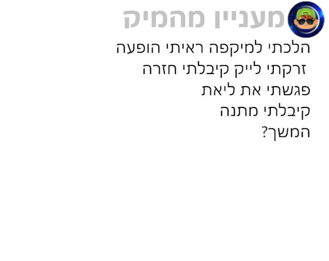 ממש יפה ,אהבתי מאוד קצת קשה להמשיךאתה יכול להמשיך משהו עם שמחתי מאוד או משהו כזה מזל טוב לזוכים!!!!! |