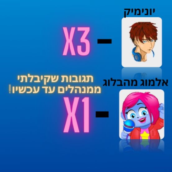 יאי, איזה כיף שקיבלתה תגובות מי מנהלים! ושוב, מאלמוג מהבלוג! (רציתי לומר שהתמונה של יונימיק, היא היא מציור של נעהקירל88. כדאי לך לתת לה קרידיט כי זה לא הכי נעים :)) |