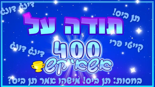 היושדיי רציתי להגיד תודה רבה על 400 אשא"קש (אנשים שאוהבים את הקהילה שלי) כי אתם לא סתם 'עוקבים'- 'עוקבים' זאת מילה משעממת, אתם לא משעממים! אתם אנשים מופלאים שאוהבים את התוכן שאני יוצר!, ואני לא גאה בזה שיש לי 'עוקבים' אני גאה בזה שיש לי 'אנשים שאוהבים את הקהילה שלי' שאוהבים את התוכן שאני יוצר,