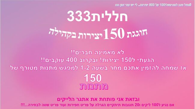 אני אשמח להשתתף בהגרלה!!!!! לא ראיתי את היצירה לצערי ולא הספקתי להגיע. לא נורא, העיקר שאוכל להשתתף בהגרלה ושאת הגעת ל150 יצירות! יצירה מושלמת! אוהבת |