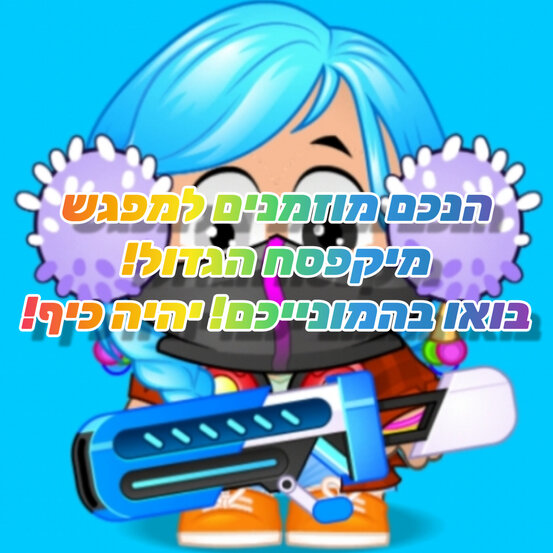 מי היה מאמין? רק נגמר פורים וכבר עוד שבועיים כבר מתחיל פסח! ולא רק פסח הוא זה שמתקרב יחד עם פסח ברגעים אלו אני מארגנת מפגש ענקי! ושמו יהיה מיקפסח! המפגש הולך לכלול ככה: חלוקת מתנות ממני חלוקת מתנות ממנהלים (לא בטוח) חלוקת פריטים ממנהלים (לא בטוח) עושה סרטונים לערוץ שלי איתכם! והכי אבל הכי חשוב! כמה שיותר כיף! מה נשתנה הלילה הזה מכל הלילות? מכל הלילות? אופס... סליחה שהייתם צריכים לשמוע את זה... אני פשוט כולי בחזרות לכבוד 4 הקושיות שלי קיבלתי סולו הא? תפקיד חשוב מאוד בסדר! אה ושאלה איפה אתם עושים את הסדר? אני עוד לא יודעת כלכך אבל מי שכבר יודע שיכתוב!! המפגש יתקיים במיקמק 2 בתאריך ה21 למרץ בשרת תות בננה בשעה 15:00 ויסתיים בשעה 16:30 מקווה לראות אותכם! בואו בהמונייכם!