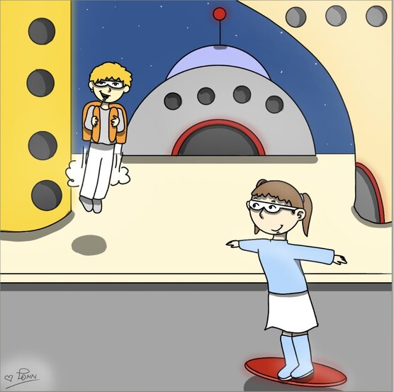 היושששש אז זאת היצירה שלי לבלוג הפרס. בציור רואים ילדה עפה על סקייטבורד מעופף (בלי גלגלים) וילד עף על טיל סילון. ברקע רואים בנינים בתים ומגדלים בצורות מוזרות ושונות. בחרתי לעשות את זה בלילה כי אז הכל זוהר וממש יפה!!!