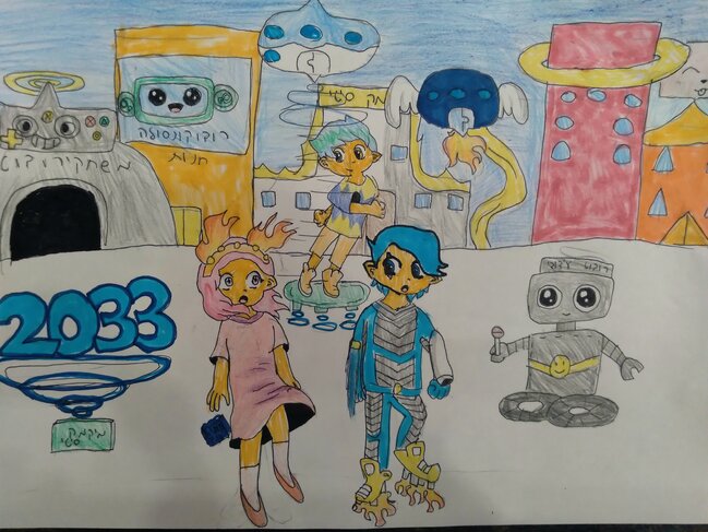כן אני חושבת שזה היה די ברור אז עשיתי יצירה לבלוג הפרס אחרי שלא עשיתי הרבה זמן יצירה לבלוג הפרס אבל זה משעמם בואו נדבר על הסיפור כי הוא קצת יותר מעניין. אז אלמז הבן ואלמז הבת הגיעו לעתיד 10 שנים קדימה ושם הם נראים מבוגרים אלמז הייתה מדענית יוצרת גאונה וגם מי שהמציאה את רוב הדברים החדשים חוץ מקורנפלקס הלבבות בטעם תות שאת זה המציא היריב שלה אלי אבל חברה זה רק קורנפלקס! אלמז הבן ניהיה. כן כן אביר!' לא צפוי אביר חדשני יש חו חליפת שריון כן זה היתדכן זה כבר לא כבד יש לו חרב חשמלית ורובה שמחובר לחליפה מגניב נכון?. עכשיו קצת רקע יש בציור רובוט חמודי קוראים לו רובוט עידודי המצאה של אלמז הבת זה רובוט שהולך(נוסע) ברחובות ומחלק הנשים עצובים(וגם לא עצובים) סוכריה וגם מישפטים מעודדים ועם המצב באמת חמור אז גם כסף אבל אל תגלו את זה! אפשר לראות את העיר העתידנים עם משחקית הרובוטים שאני מאוד ממליצה עליו ויש ילד שגולש בסקייטבורד מעופף ובתים מעופפים וגם יש הולוגרמה שאומרת את השנה זה היה לקטע ועכשיו אחרי כל החפירות הגיע הזמן שניכנס לסיפור!