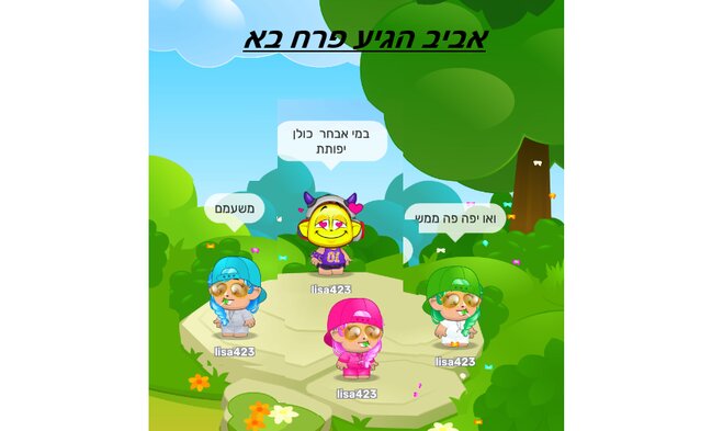 היי חברים מה קורה? זוכרים שהעלתי את היצירה של אביב הגיע פרח בא לא התלהבתי ממנה אז הכנתיחדשה הרבה יותר יפה מהקודמת לדעתי טוב בואו נסביר לכם מה קורה שם יש שם שלישיה שיצאו לטייל הירוקה ממש אאהבה מה שהיה שם גם הורודה אבל האחרונה לא הכי התלהבה וגם היה שם בן שמאוהב בכולן ולא יודע במי לבחור כי כולן ממש דומות